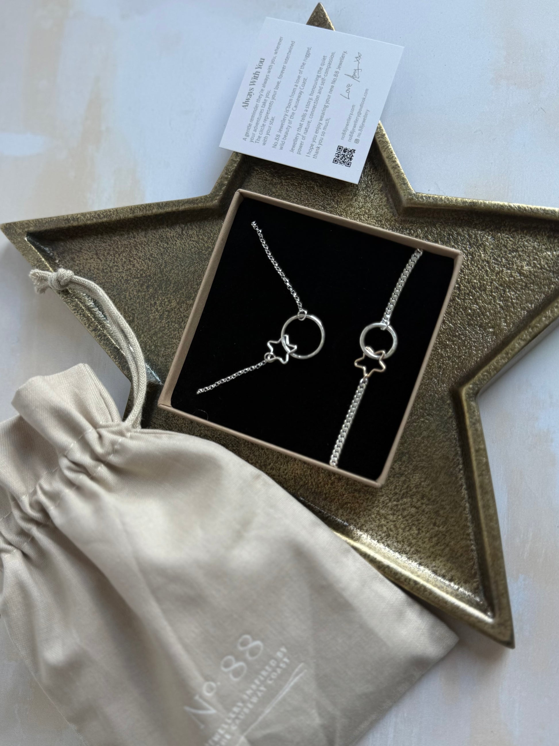 The Sterling Silver necklace features a delicate circle and star, symbolising your everlasting love, forever intertwined with your star.